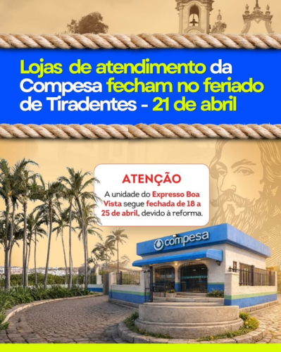 As lojas de atendimento da Compesa e as unidades nos Expressos Cidadão estarão fechadas na terça-feira (21), devido ao feriado de Tiradentes, mas o atendimento presencial será retomado na quarta-feira (22), em horário habitual.