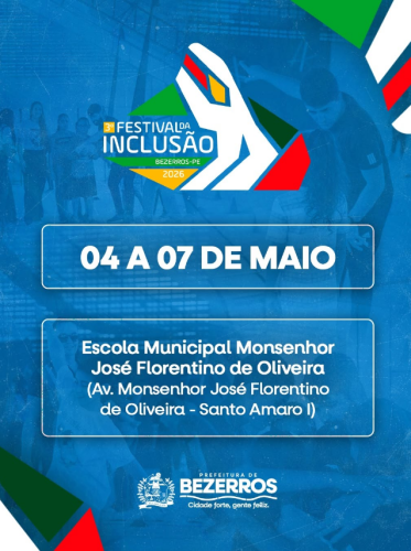 De 04 a 07 de maio, a Prefeitura de Bezerros realiza o 3º Festival da Inclusão, com uma programação voltada à vivência, interação e protagonismo dos estudantes da rede municipal.