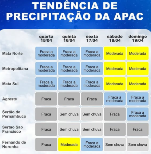Na manhã desta terça-feira, 14 de abril, a APAC – Agência Pernambucana de Águas e Clima, emitiu atualizações sobre precipitação de chuva, que conta desta quarta-feira (15) até domingo (19).
