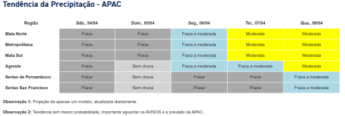 Na manhã desta sexta-feira (03), a Agência Pernambucana de Águas e Clima – Apac, atualizou os dados sobre previsões referentes a tendências de chuvas em Pernambuco, para a próxima semana até a quarta-feira (08) conforme cada região.Confira: